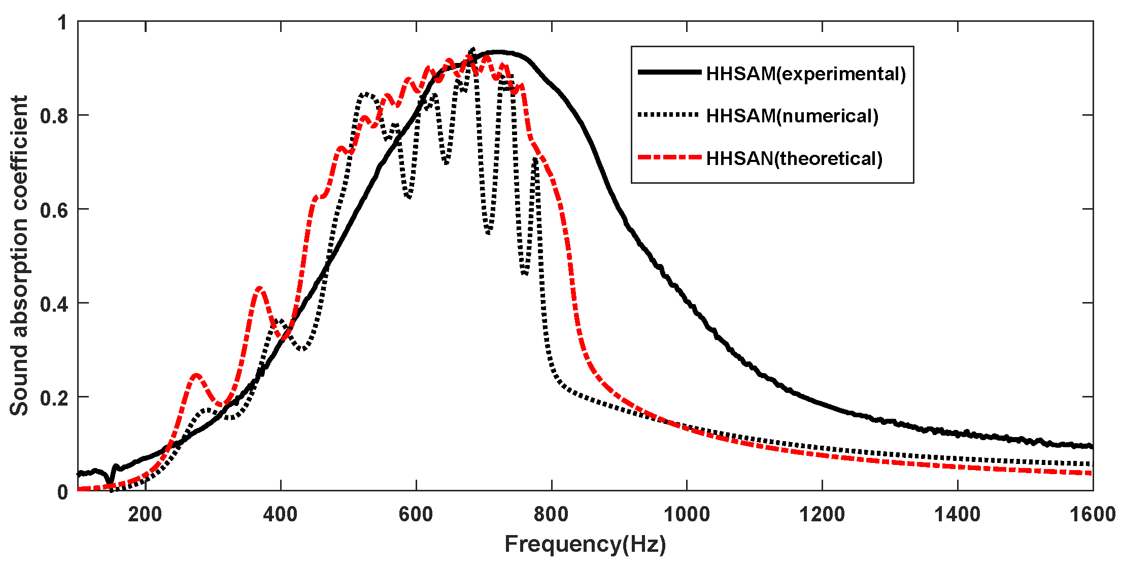 Figure 9. The theoretical, numerical, and experimental sound absorption curves of the HHSAM structure.