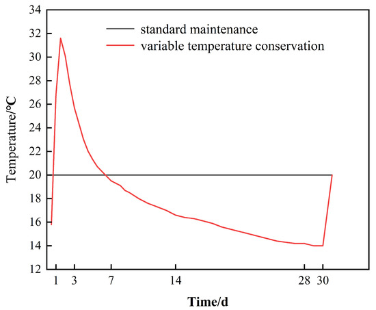 This test, conducted at the standard maintenance temperature (20 °C), consisted of a box of the proposed environmental temperature to simulate the actual temperature of the site for variable temperature maintenance. The standard curing specimen number is DRH-I. The specimen number of quasi-environmental maintenance is DRH-II. The first 30 days of aging were spent in curing at different temperatures. The same standard maintenance was carried out in the following 60 days. The curing temperature is shown in Figure 1.