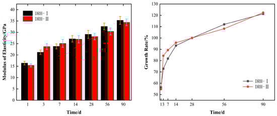 Elastic modulus is also an important index in the mechanical properties of concrete. This test is maintained by two curing temperature methods. The corresponding elastic modulus of concrete and its growth rate are obtained, as shown in. Figure 3. The left side of the figure shows the elastic modulus of concrete, which is basically the same in terms of development as compressive strength. Among them, at 3 d and 7 d of age, DRH-II was 2.5 GPa and 1 GPa higher than DRH-I, respectively. The right side of the figure is the growth rate of the elastic modulus of concrete. Taking 28 d age as the reference value, at 3 d and 7 d of age, the growth rate of DRH-II was 11.4% and 6.6% higher than that of DRH-I, respectively. As the temperature decreases, the growth rate also decreases. The growth rate of DRH-II is still lower than that of DRH-I when cured at the same temperature. At the age of 90 days, the difference between the two was 2.3%. As with the compressive strength, it is found that the temperature change has an effect on the compressive index of concrete mechanical properties. The continuous and stable growth of the modulus of elasticity can resist the deformation of concrete due to drying shrinkage and so on. This is the same as the Zhou Shihua [19] study.