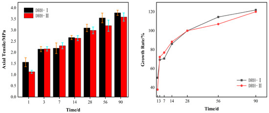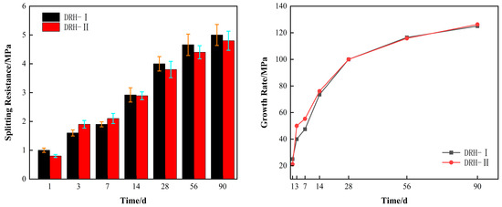 The axial tensile strength of concrete is very important to the crack resistance of concrete. The left side of Figure 5 shows the axial tensile strength of concrete. The strength of DRH-II was 0.1 MPa and 0.21 MPa higher than that of DRH-I at 3 d and 7 d of age. The right side of the figure shows the growth rate of the axial tensile strength of concrete. The age of 28 d is the reference value. The growth rate of DRH-II was 2.8% and 9.7% higher than that of DRH-I at 3 d and 7 d. In the later period, the growth rate decreased due to the decrease in temperature. However, at the age of 90 d, the growth rate of DRH-II was 1.3% higher than that of DRH-I. Concrete has the characteristics of compressive strength and tensile strength. Combined with splitting tensile strength, it shows that the temperature change is more sensitive to the tensile strength of concrete.