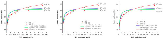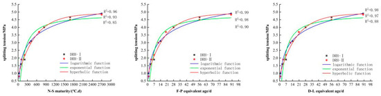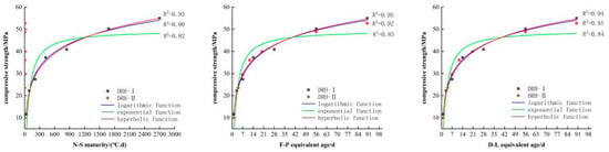 Combined with the above, we can conclude that the increase in curing temperature will increase the strength of concrete. To further analyze the relationship between curing temperature and strength, according to previous experience and relevant norms, we then used three maturity calculation formulas to calculate the maturity index. The exponential, logarithmic, and hyperbolic functions serve as the three types of function fitting. The highest precision is selected to represent the relationship between maturity and strength development.