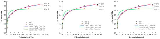 After the maturity value is obtained, the maturity strength relationship fitting equation can be determined. The exponential, logarithmic, and hyperbolic curves were used to fit the compressive strength, splitting tensile strength, axial tensile strength, and maturity, respectively.