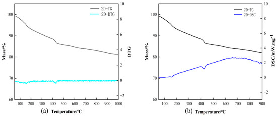 The test results are shown in Figure 11. Figure 11a shows the TG-DTG plot. It can be seen that the quality of the low-heat cement decreases as the temperature increases. Sharp weight loss occurred at 400 °C. From the DTG, it can be seen that the rate of decline in low-heat cement is relatively flat. This indicates a more stable structure in the low-heat cement system. Figure 11b shows the TG-DSC plot; heat loss by heat absorption occurs at 400 °C in the heat flow curve, suggesting that 90 d old Ca(OH)2 decomposes due to heat absorption at this time and that Ca(OH)2 content decreases in later stages. DSC’s heat absorption peak matches the TG weight loss peak. The onset and termination temperatures of the decomposition of Ca(OH)2 crystals can be calculated to give the Ca(OH)2 content per 100 g of the sample. The Ca(OH)2 of the low-heat cement paste sample was 8.23 g.