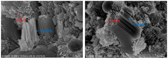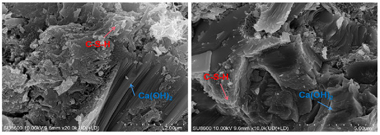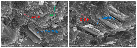 The results are shown in Figure 13, Figure 14 and Figure 15. It is found that Ca(OH)2 in low-heat cement is mostly stacked in flakes. There is good compactness throughout the early to later stages. It is surrounded by C-S-H gel. The early C-S-H gel of low-heat cement is distributed sporadically in the form of agglomerates, so the early mechanical properties of DRH are low. Later on, by virtue of the high content of C2S, it gradually wraps the fly ash and Ca(OH)2 tightly in a fine mesh. The ability to fill pores can make the concrete structure more stable. It also retains a considerable amount of Ca(OH)2 to ensure late strength development. This is beneficial to the continuous improvement of the mechanical properties; maintaining the overall cracking resistance to improve the long-term cracking resistance of concrete is important. Some calcite was found at 90 d, but it was mostly small and scattered and would not undergo expansion damage.