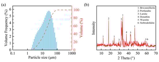 The steel slag powder utilized in this study was obtained from an alkaline oxygen furnace supplied by a firm based in Wuhan, Hubei. Before conducting the experiment, the steel slag powder was dried at 60 °C for 24 h to eliminate residual moisture. The density of the steel slag powder was measured to be 3.551 g/cm3 via the pycnometer method (the pycnometer method is a density measurement technique grounded in Archimedes’ principle, where the sample density is calculated through the precise volumetric displacement measurement of a reference liquid within a calibrated vessel), and its specific surface area was measured at 349 m2/kg using a Micromeritics ASAP 2460 automatic surface area analyzer (Micromeritics, Norcross, GA, USA). Figure 1a illustrates the particle size distribution of the steel slag powder ranging from 1.905 µm to 104.729 µm. Table 1 and Figure 1b present the chemical composition and major mineralogical constituents of the steel slag powder, revealing three predominant crystalline phases including Larnite (Ca2SiO4), Srebrodolskite (Ca2Fe2O), and Portlandite (Ca(OH)2).