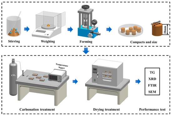 After demolding, the steel slag compacts were immediately subjected to a carbonation curing treatment. Specimens with different compaction degrees were individually placed in gas-tight reaction chambers maintained at a CO2 concentration of 99.9% with a constant pressure at 0.1 MPa. The carbonation system was equipped with a gas flow meter to the ensure rigorous control of the reaction environment. To systematically investigate the temporal evolution of carbonation, four distinct curing durations (1, 3, 6, and 9 h) were implemented. After curing, the steel slag compacts were dried at 60 ± 2 °C for 6 h. Subsequently, a comprehensive characterization was performed to evaluate the mechanical properties, phase composition, and microstructural evolution of the carbonated compacts. The complete experimental procedure, encompassing specimen preparation and carbonation treatment, is schematically illustrated in Figure 2.