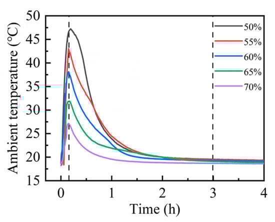 Upon exposure to carbon dioxide, steel slag compacts with different compaction degrees exhibited rapid exothermic carbonation reactions, resulting in significant thermal release and the consequent elevation in environmental temperature [30,31]. The thermal evolution during the carbonation process was continuously monitored using a precision temperature logger, enabling the real-time tracking of temperature fluctuations. As illustrated in Figure 3, the carbonation environment temperature demonstrated a characteristic thermal profile, reaching its maximum value approximately 15 min after reaction initiation. Subsequently, the temperature gradually decreased, stabilizing at ambient conditions after approximately 3 h, indicating the establishment of thermal equilibrium. Notably, the peak reaction temperature achieved at 15 min exhibited compaction degree dependency. The experimental data revealed an inverse correlation between the compaction degree and peak carbonation temperature. Specifically, the 50% compaction specimen attained the highest peak carbonation temperature of 47.0 °C, while the 70% compaction specimen exhibited the minimum peak temperature of 27.0 °C. This thermal behavior suggests that the increased compaction degree corresponds to reduced carbonation reaction intensity, as evidenced by the progressive decrease in peak temperatures with higher compaction levels.