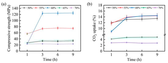 The carbonation behavior of steel slag compacts exhibited significant compaction degree dependency, profoundly affecting their mechanical properties and CO2 uptake capacity. To systematically evaluate these effects, comprehensive assessments of the compressive strength and CO2 uptake capacity were conducted, with the results presented in Figure 4. Figure 4a illustrates the temporal evolution in the compressive strength for steel slag compacts with varying compaction degrees. Notably, compacts with 50%, 65%, and 70% compaction degrees demonstrated minimal strength enhancement within the initial hour of carbonation, whereas compacts with 55% and 60% compaction degrees exhibited substantial strength improvements. This mechanical enhancement can be attributed to the pore-filling effect of carbonation products formed through the steel slag–CO2 reaction, which increases matrix densification and consequently improves compressive strength. After 3 h of carbonation, the compressive strength of steel slag compacts with different compaction degrees stabilized, correlating well with the thermal equilibrium state observed previously.