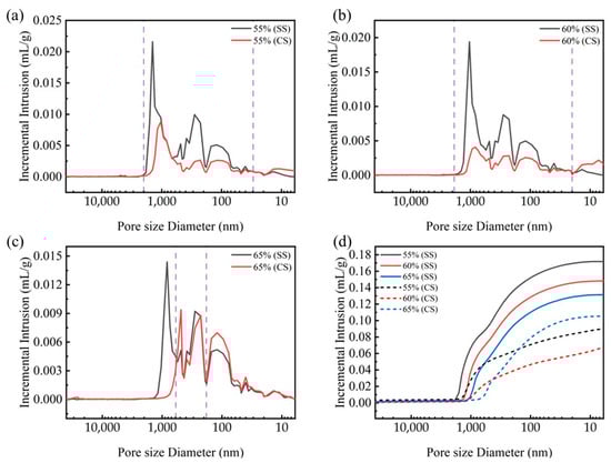Pore distribution and cumulative intrusion (d) of steel slag compacts 6 h after curing at varying compaction degrees, (a) CS55, (b) CS60, (c) CS65.