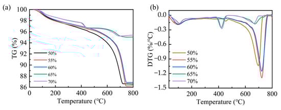 The carbonation efficiency of steel slag compacts exhibits compaction degree dependency. To further elucidate the carbonation mechanism, a thermogravimetric analysis (TGA) was employed to quantify the carbonation products of steel slag compacts with different compaction degrees. As shown in Figure 8, the predominant mass occurred within the temperature range of 300–800 °C, corresponding to the thermal decomposition of carbonates. This characteristic mass loss serves as a reliable indicator for quantifying carbonation product formation [23,35]. The quantitative analysis of the mass loss data presented in Table 4 revealed that the amount of carbonation products decreases as compaction increases. Specifically, the steel slag compacts with intermediate compaction levels of 50%, 55%, and 60% demonstrated a significantly higher carbonate content compared to those with higher compaction levels of 65% and 70%. This observation indicates that optimal compaction facilitates more complete carbonation reactions, resulting in enhanced carbonation formation and consequent improvement in mechanical properties. Conversely, excessive compaction suppresses the carbonation process through restricted CO2 diffusion, thereby diminishing both the reaction efficiency and mechanical performance enhancement.