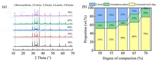 XRD patterns (a) and the ratio of mineral phases (b) in steel slag compacts at varying degrees of compactness.