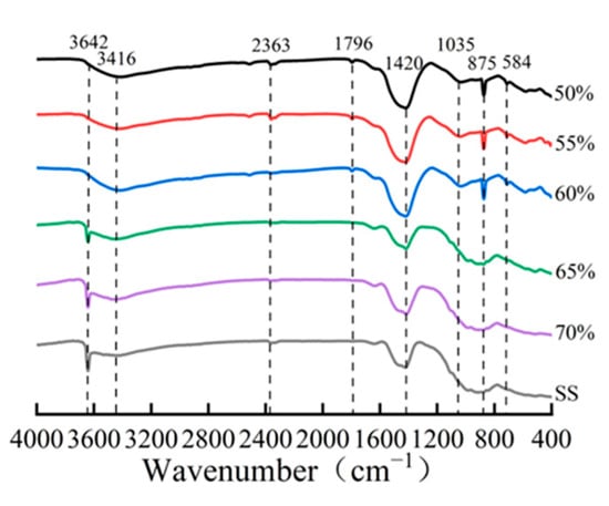 The quantitative phase analysis in Figure 9b reveals a critical compaction threshold at approximately 65%. Below this threshold, the compacts exhibit a higher carbonation degree and correspondingly greater carbonate product formation. However, beyond this critical value, both the carbonation degree and calcite content showed a marked reduction. This observation is further corroborated by FTIR analysis (Figure 10), where the characteristic calcium carbonate absorption band at 875 cm−1 [17,25] showed significant attenuation at compaction degrees exceeding 65%. These complementary analytical results consistently demonstrate that excessive compaction inhibits carbonation product formation through restricted CO2 diffusion and limited reaction space.