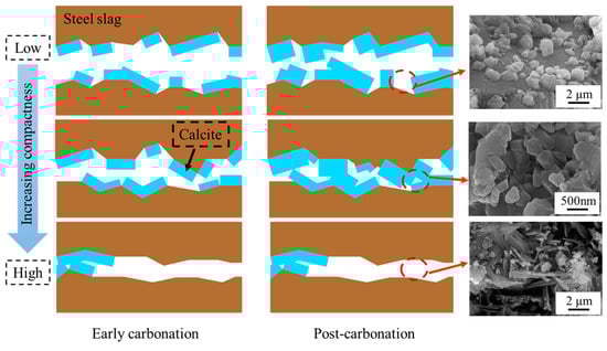 The mechanistic influence of the compaction degree on the carbonation performance of steel slag compacts is schematically illustrated in Figure 12. In the early stages of carbonation, the reaction between steel slag and carbon dioxide generates substantial amounts of calcium carbonate, which effectively fills the porous matrix [41]. For compacts with low to medium compaction degrees, this pore-filling mechanism enhances the matrix density, leading to significant improvement in mechanical properties. Nevertheless, in highly compacted steel slags, although calcium carbonate initially fills available pores, it simultaneously occludes the diffusion pathways of carbon dioxide, thereby inhibiting subsequent carbonation reactions and limiting overall carbonation efficiency.
