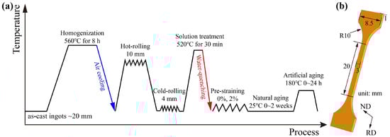 Table 1 presents the chemical compositions of three experimental Al-Mg-Si-Cu alloys with varying Cu contents (designated as 0Cu, 0.2Cu, and 0.7Cu). The alloys were prepared using industrial pure Al (99.7 wt.%) and master alloys containing Al-10 wt.% Mg, Al-20 wt.% Si, Al-50 wt.% Cu, Al-20 wt.% Fe, and Al-10 wt.% Mn. Precisely weighed raw materials were melted in a graphite crucible using a resistance furnace. To minimize oxidation, the furnace chamber was purged with high-purity argon gas (99.8%) prior to heating, and a continuous argon flow (0.5 L/min) was maintained throughout the melting process. Melting was conducted at 740 ± 10 °C for 40 min with intermittent mechanical stirring to ensure compositional homogeneity. The melt was then poured into a preheated (250 °C) cast steel mold with a rectangular cavity (dimensions: 100 mm × 150 mm × 20 mm) using a tilt-pouring technique. The entire process was completed within an argon-protected environment to prevent gas entrapment and oxide formation. Chemical composition verification was performed through optical emission spectroscopy (HITACHI OE750, HITACHI, Tokyo, Japan) prior to subsequent processing. The as-cast ingots underwent homogenization treatment at 560 °C for 8 h in a forced-air circulation furnace, followed by furnace cooling to an ambient temperature. Surface preparation included mechanical milling to remove 1 mm from each face, eliminating surface oxidation and casting defects. Thermomechanical processing consisted of two stages: hot rolling from 18 mm to 10 mm thickness at 460 °C (reduction rate: 0.8 mm/pass), followed by cold rolling to final 4 mm sheets (total reduction: 60%). Solution treatment was conducted at 520 °C for 30 min in a salt bath, with immediate water quenching to room temperature. Post-quench processing involved two experimental conditions: (1) direct NA for 14 days at room temperature and (2) the application of 2% tensile pre-straining (PS2) prior to NA. All specimens subsequently underwent artificial aging at 180 °C for durations ranging from 0 to 24 h. Additionally, a simulated paint bake cycle (180 °C/30 min) was applied to selected samples during natural aging. The complete experimental sequence is schematically illustrated in Figure 1a.
