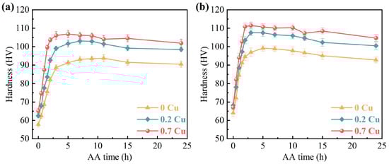 After a pre-straining of 2%, the three investigated alloys exhibited similar hardening rates in the early artificial aging period (Figure 2b). In comparison to the without pre-straining alloys, the 0.7Cu alloy maintained the highest hardness throughout the artificial aging process, while the 0Cu alloy exhibited the lowest hardness. The peak hardnesses of the 0Cu, 0.2Cu, and 0.7Cu alloys were 99.2 HV, 107.6 HV, and 111.7 HV, respectively, which were 5.4 HV, 4.5 HV, and 4.8 HV higher than those of the non-pre-strained alloys. More importantly, pre-straining significantly reduces the time required to reach peak aging. The peak aging times were reduced to 7 h, 5 h, and 2 h for the 0Cu, 0.2Cu, and 0.7Cu alloys, respectively. This result implies that the introduction of pre-straining effectively promotes the age-hardening behavior of the alloys. In particular, this enhancement is more pronounced in the 0Cu alloy, suggesting potential differences in its response to pre-straining as compared to the 0.2Cu and 0.7Cu alloys.