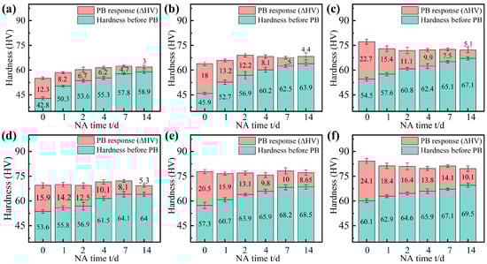 Figure 3 demonstrates the NA behavior and PB hardening increments (ΔHV) of AA6111 alloys with varying Cu content (0Cu, 0.2Cu, 0.7Cu) under pre-strained and non-pre-strained conditions during natural aging. The base hardness of the alloys exhibited a progressive enhancement with increasing Cu content. For non-pre-strained samples (Figure 3a–c), a monotonic hardness increase was observed across all alloys as NA duration extended from 0 to 14 days, while the PB increment demonstrated an inverse relationship, decreasing by 75.6% (0Cu), 75.6% (0.2Cu), and 77.5% (0.7Cu), respectively. The 0.7Cu alloy consistently demonstrated superior BHR compared to the Cu-free counterpart throughout the 0–14 days of NA, underscoring the critical role of Cu in retaining bake-hardening potential. Freshly solution-treated samples (without NA) exhibited maximum PB increments, with 0Cu, 0.2Cu, and 0.7Cu alloys achieving 12.3 HV, 18 HV, and 22.7 HV, respectively. After 14-day NA, the hardness of the 0Cu alloy increased from 42.8 HV to 58.9 HV, while the PB increment was only 3 HV (Figure 3a), which was significantly lower than that of the direct PB sample (ΔHV = 12.3 HV). Similarly, the hardness of the 0.2Cu and 0.7Cu alloys increased from 57.3 HV to 68.5 HV and 54.5 HV to 67.1 HV, respectively, while the PB increments were only 4.4 HV and 5.1 HV. Accordingly, although the addition of Cu could enhance the BHR of AA6111 alloy, it is difficult to effectively suppress the negative effects of NA.