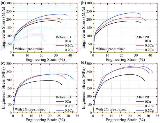 Stress–strain curves (a,c) before and (b,d) after PB treatment for three alloys. (a,b) Non-pre-straining and (c,d) 2% pre-straining.