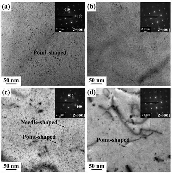 For 6xxx series Al alloy sheets used in automobiles, BHR and resistance to NA effects are two critical performance indicators [26,27,28]. Superior NA resistance effectively reduces the difficulty of stamping processes for structural components, whereas an enhanced BHR improves the strength of final structural parts [29]. In this study, we investigated the effect of Cu addition on the artificial aging response of the AA6111 alloy. The results demonstrated that increasing the Cu content significantly accelerated the hardening rate and shortened the time to peak aging (Figure 2a). During natural aging, Cu atoms are incorporated into the Mg-Si co-clusters and form Mg-Si-Cu co-clusters [30], thereby increasing the (Mg + Cu)/Si ratio and promoting the formation of Clusters (2) [31,32]. Additionally, prior studies suggest that Cu addition lowers the activation energy of precipitate nucleation [33]. Consequently, during subsequent artificial aging, Cu addition effectively promotes the direct transformation of more Clusters (2) into GP zones and β″ and Q′ phases, resulting in accelerated aging kinetics. With an increasing Cu content, the hardness of solution-treated alloys increases from 57.8 HV for 0Cu to 65.2 HV for 0.7Cu, attributed to solid solution strengthening caused by Cu dissolution in the α-Al matrix. The peak-aged hardness increases from 93.8 HV for 0Cu to 106.9 HV for 0.7Cu, owing to the combined effects of solid solution strengthening and precipitation hardening during subsequent artificial aging. In non-pre-strained alloys, the 0.7Cu alloy exhibited smaller-sized and higher-density precipitates after paint baking (PB) compared to the 0Cu alloy (Figure 5), indicating that Cu-induced microstructure refinement contributes to enhanced precipitation hardening.