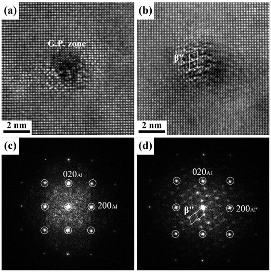 HRTEM images and corresponding FFT patterns of the dot-shaped precipitates in the non-pre-strained alloys. (a,c) GP zone from 0Cu alloy (0 d); (b,d) β″ phase from 0.7Cu alloy (14 d).