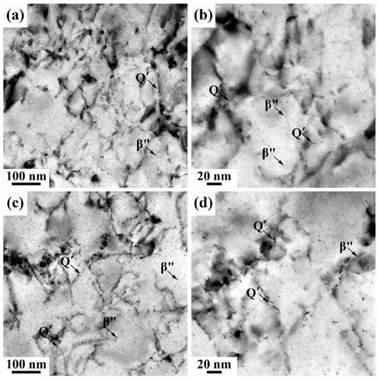Bright-field TEM images of 0.7Cu alloy with 2% pre-straining subjected to PB treatment after different times of NA. (a,b) Without previous NA; (c,d) NA 14 days.