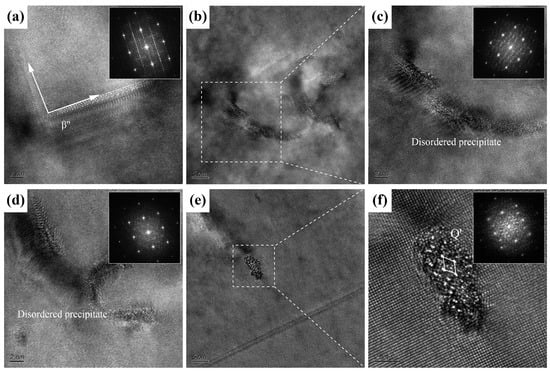 HRTEM images of typical precipitates in 0.7Cu alloy with 2% pre-straining. (a) Mutually perpendicular β″ phase; (b–d) precipitates along dislocation lines; (e,f) Q′ phase.