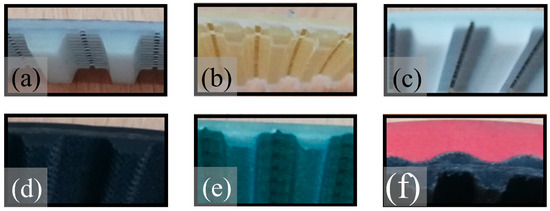 Toothed belts: (a) P1, (b) P2, (c) P3, (d) P4, (e) P5, and (f) P6.