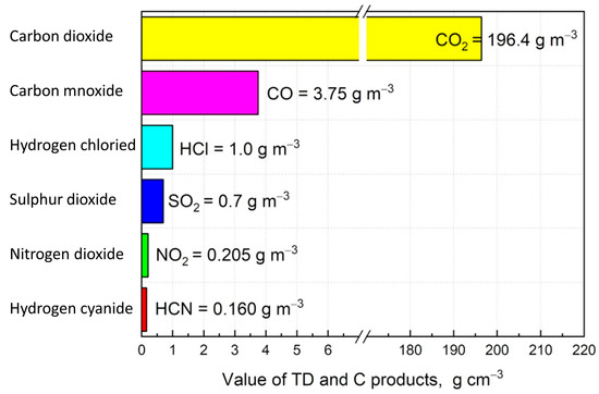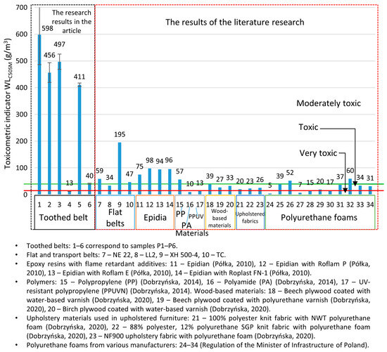 The main classification criterion for toxic products from the thermal decomposition and combustion of materials is the toxicometric indicator (WLC50SM) according to PN-B-02855 [30], which is presented in Figure 3.