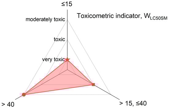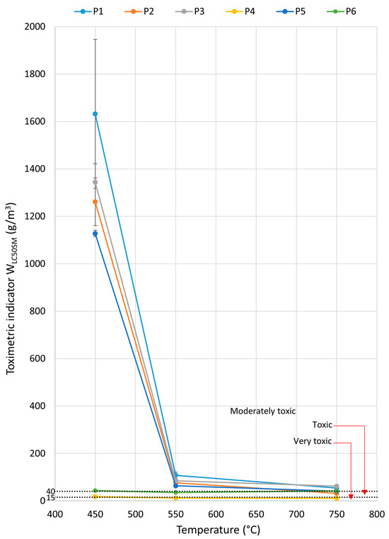 - The toxicometric indicator (WLC50SM) represents the arithmetic mean of the WLC50M values determined at different temperatures (450 °C, 550 °C, and 750 °C), as shown in Equation (3).
