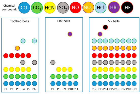 Comparative analysis of toxic emissions generated during the thermal degradation and combustion of toothed and flat belts [18,19] and V-belts [17], where P1–P6 are the toothed belts described in this article, P7–P11 are flat belts described by Krawiec et al. in 2020 [18], and P12–P19 are V-belts described by Krawiec et al. in 2020 [17].