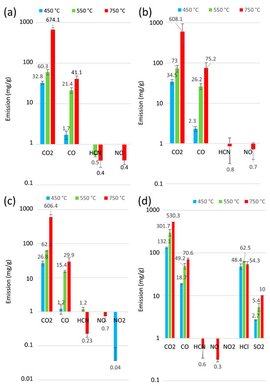 Release of byproducts from the thermal degradation and combustion of toothed belts at 450 °C, 550 °C, and 750 °C: (a) P1, (b) P2, (c) P3, (d) P4.