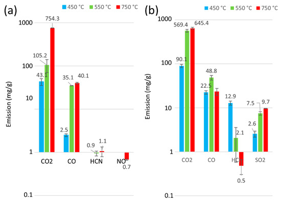 Release of byproducts from the thermal degradation and combustion of toothed belts at 450 °C, 550 °C, and 750 °C: (a) P5, (b) P6.