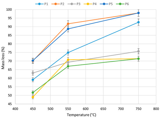 Mass loss of P1–P6 toothed belts undergoing thermal degradation and combustion at 450 °C, 550 °C, and 750 °C.