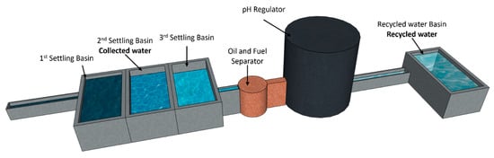 The second type is recycled water (RW), the result of a complete industrial recycling process. This process includes three settling basins to remove solid particles, an oil and hydrocarbon separator, and pH adjustment by injection of carbon dioxide (CO2). This treatment stabilizes the water’s physico-chemical properties and guarantees its compliance with industrial standards for concrete. This system was implemented because the collected water cannot be discharged into the sumps without prior treatment due to its chemical composition and the associated environmental risks. The treatment system is illustrated in Figure 1.