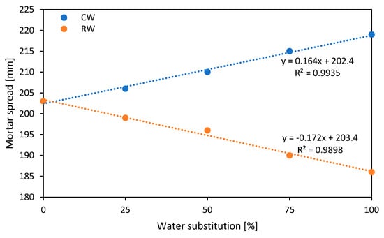 Results in Figure 2 show that the addition of CW leads to a progressive increase in the spread of the mortar, from 203 mm for the reference mortar to 219 mm with total replacement of potable water. This trend is explained by the possible presence of superplasticizer residues in the recycled water, which improves the flowability of the mixture [26]. On the other hand, the use of RW progressively reduces the spread, reaching 186 mm for 100% recycled water. This suggests that the impurities and fine particles present in the recycled water alter the rheology of the mortar, limiting its workability [26]. So, while collected water can improve workability, it needs to be controlled to avoid excessive flowability, while recycled water can make the mortar stiffer, affecting its application and workability.