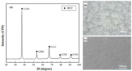 (a) XRD pattern of the Nb35Zr26Ti19Hf15Mo5 refractory high-entropy alloy; (b) optical microscopy microstructure image of the alloy after corrosion; (c) SEM microstructure image of the alloy after corrosion.