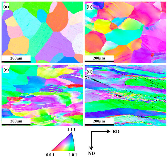 EBSD-IPF maps of the Nb35Zr26Ti19Hf15Mo5 refractory high-entropy alloy: (a) as-cast state; (b) 20% rolling reduction; (c) 50% rolling reduction; (d) 80% rolling reduction.