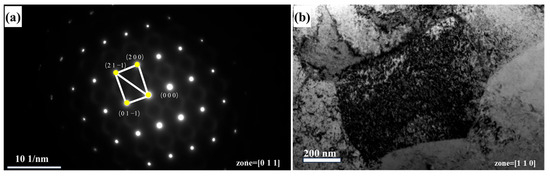 Alloy with a rolling reduction of 80%: (a) diffraction spot; (b) TEM image.
