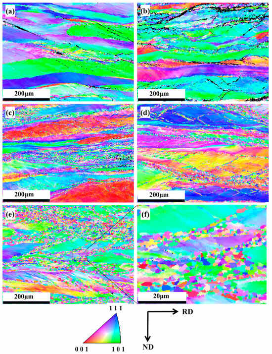(a) EBSD-IPF map of the Nb35Zr26Ti19Hf15Mo5 refractory high-entropy alloy with a rolling reduction of 80% without heat treatment and after annealing at (b) 650 °C; (c) 700 °C; (d) 750 °C; (e,f) 800 °C for 20 min.