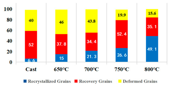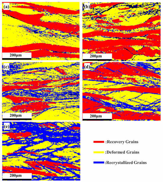 Figure 8a–e presents the EBSD-GOS maps of the microstructure evolution of the Nb35Zr26Ti19Hf15Mo5 refractory high-entropy alloy. The alloy underwent a rolling reduction of 80% and was then subjected to different treatment conditions: without heat treatment and annealing at 650 °C, 700 °C, 750 °C, and 800 °C for 20 min. In the figure, the blue region indicates the recrystallized grains with a grain orientation difference of less than 2°, which represents the core region of recrystallization, while the red region indicates the recovery region with a grain orientation difference of between 2° and 7°, which reflects the preliminary recovery of the plastic deformation experienced by the material during the rolling process. In addition, the yellow region with an orientation difference of 7–20° indicates the deformed grains remaining after rolling, and these grains have a large orientation difference, showing traces of plastic deformation. Through observation, it is found that in the case of no annealing treatment, the microstructure of the alloy is mainly composed of deformed grains, presenting an obvious deformation texture. Figure 9 shows the proportion of each region in the GOS map. Upon annealing the alloy at 650 °C, the proportion of the recrystallization region is only 15%, indicating that the effect of annealing on promoting recrystallization is relatively weak. Subsequently, with the gradual increase in the annealing temperature, the recrystallization process is significantly accelerated. Specifically, at 700 °C, the proportion of the recrystallization region rises to 21.3% and further increases to 26.6% at 750 °C. Furthermore, when the annealing temperature reaches 800 °C, the proportion of the recrystallization region significantly increases to 49.1%, clearly indicating that the increase in the annealing temperature has a significant promoting effect on the recrystallization kinetics.