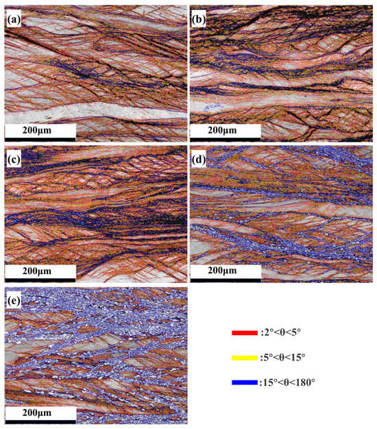 During the rolling deformation process, as the degree of deformation increases, the content of grain boundaries and the density of sub-structures such as dislocations in the alloy change accordingly. Figure 4a–d shows the EBSD-distribution maps of low-and high-angle grain boundaries of the Nb35Zr26Ti19Hf15Mo5 alloy in the as-cast state and under rolling reductions of 20%, 50%, and 80%. In Figure 4, the red lines represent low-angle grain boundaries with an orientation difference of 2–5°, the green lines represent medium-angle grain boundaries with an orientation difference of 5–15°, and the blue lines represent high-angle grain boundaries with an orientation difference of 15–180°. As can be seen from Figure 4a, in the as-cast alloy, high-angle grain boundaries are only present at the grain boundaries, and the content of low-angle grain boundaries within the grains is relatively low. However, after rolling, a large number of low- and medium-angle grain boundaries appear within the grains. As shown in Figure 4b,c, after the alloy is rolled and deformed by 20% and 50%, the grains are elongated along the rolling direction, and multiple sets of parallel high-angle twin boundaries (blue parallel line groups) appear in some grains. Between these high-angle boundaries, it is easy to accumulate some low- and medium-angle grain boundaries. When the rolling deformation of the alloy reaches 80% (Figure 4d), the density of low- and medium-angle grain boundaries further increases. With the increase in the rolling deformation degree, in the as-cast alloy, the alloy with 20% deformation, the alloy with 50% deformation, and the alloy with 80% deformation, the proportion of the content of low- and medium-angle grain boundaries is 0.530, 0.662, 0.746, and 0.849, respectively, and the overall density of grain boundaries increases.