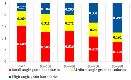 Moreover, the overall grain boundary density decreases as the annealing temperature increases. Grain boundary density is a measure of the total length of grain boundaries per unit area. With the growth of grains during the transformation from low/medium-angle to high-angle grain boundaries and the coarsening of the microstructure, the total length of grain boundaries per unit area reduces.