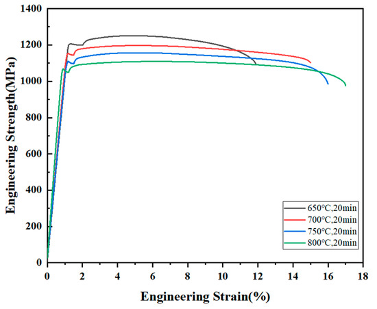 The tensile mechanical properties of the tensile samples at four different temperature gradients were tested. By analyzing the stress–strain curves shown in Figure 12, the following phenomena can be observed: with the increase in the annealing temperature from 650 °C to 800 °C, the tensile strength of the Nb35Zr26Ti19Hf15Mo5 refractory high-entropy alloy decreases from 1251 MPa to 1069 MPa.