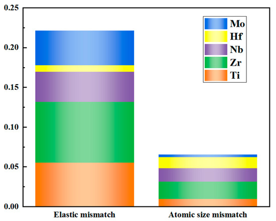 The calculation results of the misfit degree of the Nb35Zr26Ti19Hf15Mo5 alloy are shown in Figure 14. The solid solution strengthening effect of the alloy is closely related to the misfit degree. The larger the misfit degree, the better the solid solution strengthening effect of the alloy. Based on the comprehensive calculation results of the misfit degree, the following conclusions can be drawn: the contributions of the Zr element to the modulus misfit degree and the atomic size misfit degree are 34% and 33%, respectively. It plays a major role in solid solution strengthening, which is related to the large difference in its atomic size from other elements. It is worth noting that although the addition amount of the Mo element is only 5%, its contribution to the modulus misfit degree reaches 20%, having a relatively large influence.