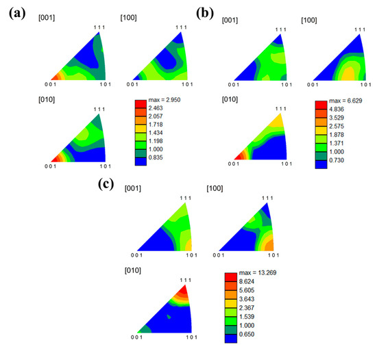 EBSD-IPF diagrams of the Nb35Zr26Ti19Hf15Mo5 alloy under different rolling reductions: (a) 20%; (b) 50%; (c) 80%.