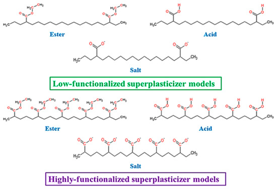 Molecular modelling was performed to support FTIR data interpretation and SP chemical structure effect on cement mix and hardened composite properties description. Gaussian 16 C.01 program was used [40]. Since both analysed superplasticizers SP-1 and SP-2 have a high molecular weight structure, it is difficult to calculate their structural and spectroscopic parameters. In addition, this work considers only contributions of certain functional groups of the superplasticizer. For this reason, simplified models were used that reasonably give the real structure of SP and the contribution of its modifications to the interactions with cement (see Figure 1) [41,42]. All calculations were performed using density functional theory (DFT) in the gas phase. B3LYP hybrid density functional was used due to its efficiency in structural and spectroscopic parameters prediction [43,44,45,46]. Since the models used were quite large, relatively small basis sets were used: 3-21G, 6-31+G* and def2-TZVP [47,48]. In order to make the most accurate analysis of the experimental data using theoretical results, a comparative analysis was performed for all obtained data. The SP models were optimized at all considered levels of the theory. Simultaneously, the IR spectra were simulated. The absence of imaginary frequencies was accepted as a criterion for the equilibrium structure.