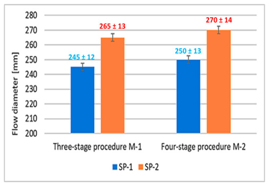 Results of concrete mix consistency measurements obtained using two mixing procedures (M1 and M2) and two different superplasticizers (SP-1 and SP-2) by a flow table test method [37], are presented in Figure 2. In this case, the increased flow of the M1 SP-2 and M2 SP-2 mix by about 20 mm was observed, compared to the flow of SP-1 containing mixes. In contrast, changing from a three-stage to a four-stage mixing procedure using both SP-1 and SP-2 increases the fluidity only by ca. 5 mm. It shows that the SP type has a greater effect on concrete mix flow than changing the mixing procedure.