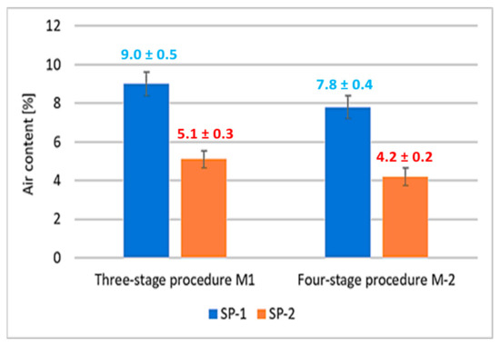 It was observed that concrete mixes with SP-2 showed a significantly lower air content by about 45% compared to mixes with SP-1 addition. Whereas, the effect of the mixing procedure on the air content was revealed to a much lesser extent. Changing the mixing procedure from a three-stage to a four-stage results in a 13% reduction in air content in SP-1 containing mixes, and 18% reduction for SP-2 containing mixes. Considering the results of the RPC mix flow tests (Figure 2), it can be concluded that increased degree of RPC fluidity results in reduction of its air content. An analogous relationship between the air content reduction in self-compacting mixes and the increase in their fluidity was demonstrated in [49].