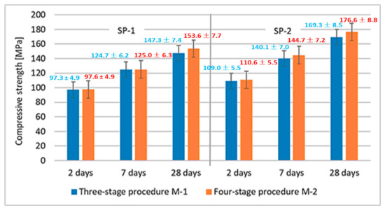 Results of RPC compressive strength tests are shown in Figure 4. A significantly higher effect of the superplasticizer type used is observed in comparison with the mixing procedure. The compressive strength is higher by ca. 12–16% for M1 SP-2 and M2 SP-2 mixes.