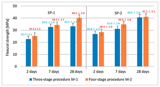 The effect of M1 and M2 mixing procedures after 2, 7 and 28 days of curing are more or less similar. The largest difference is observed after 28 days, when the compressive strength of RPC, using the four-stage mixing procedure, is by ca. 7 MPa higher. Results of RPC flexural strength tests are shown in Figure 5. Results of RPC flexural strength testing showed that, analogous to the compressive strengths, concretes achieve higher strength values when SP-2 is used (Figure 5). It has been found that application of different mixing procedures for RPC mix (M1 and M2) affects the flexural strength. In this case, using the M2 procedure, provides higher flexural strength values.
