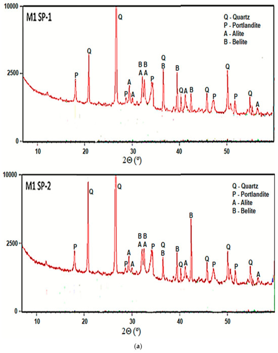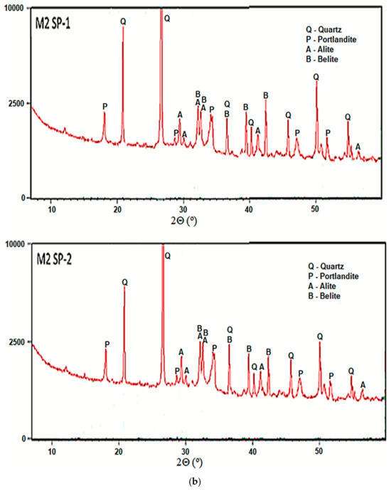 XRD of RPC specimens for RPC mixes with SP-1 and SP-2 obtained (a) using M1 and (b) M2 procedures after 2 days of curing.